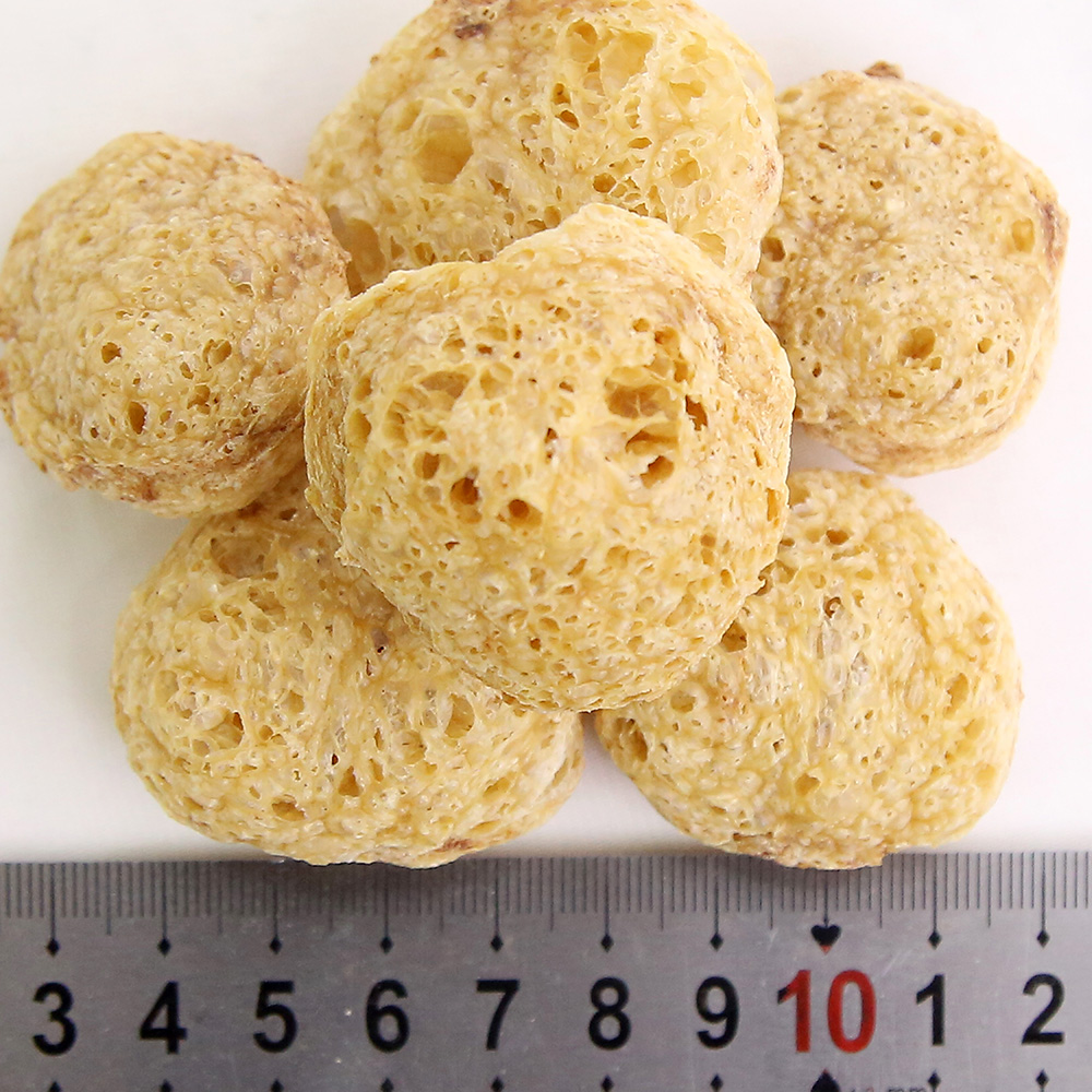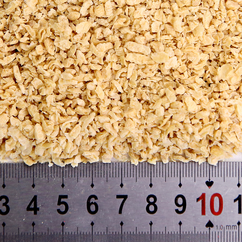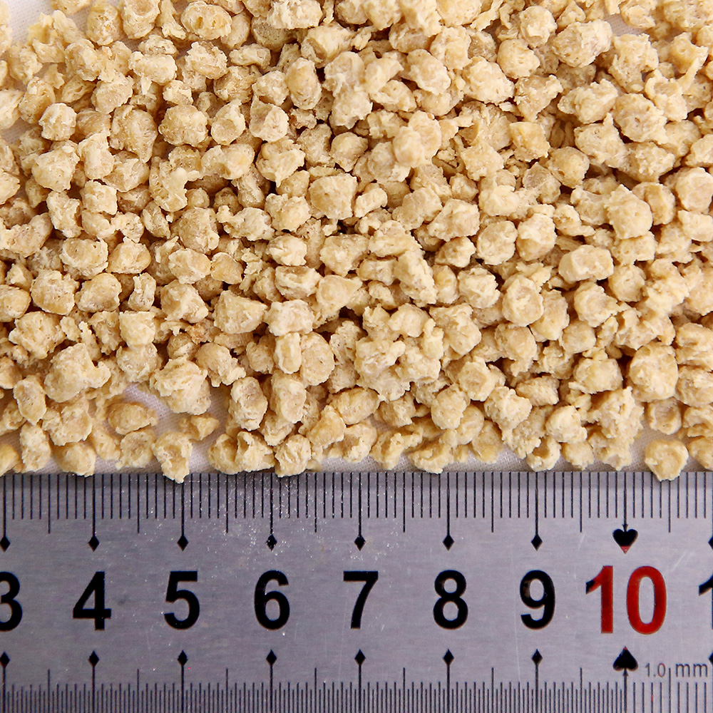 該產(chǎn)品是將分離蛋白、大豆?jié)饪s蛋白、低溫豆粕、谷朊粉、淀粉依產(chǎn)品配方比例經(jīng)擠壓膨化、高溫高壓處理而成,具有良好的吸水性、保油性和類似肉的纖維結(jié)構(gòu),富有咀嚼感,是一種理想的高蛋白肉制品添加物、休閑豆制品的輔料。產(chǎn)品類型包括TW系列、TB系列